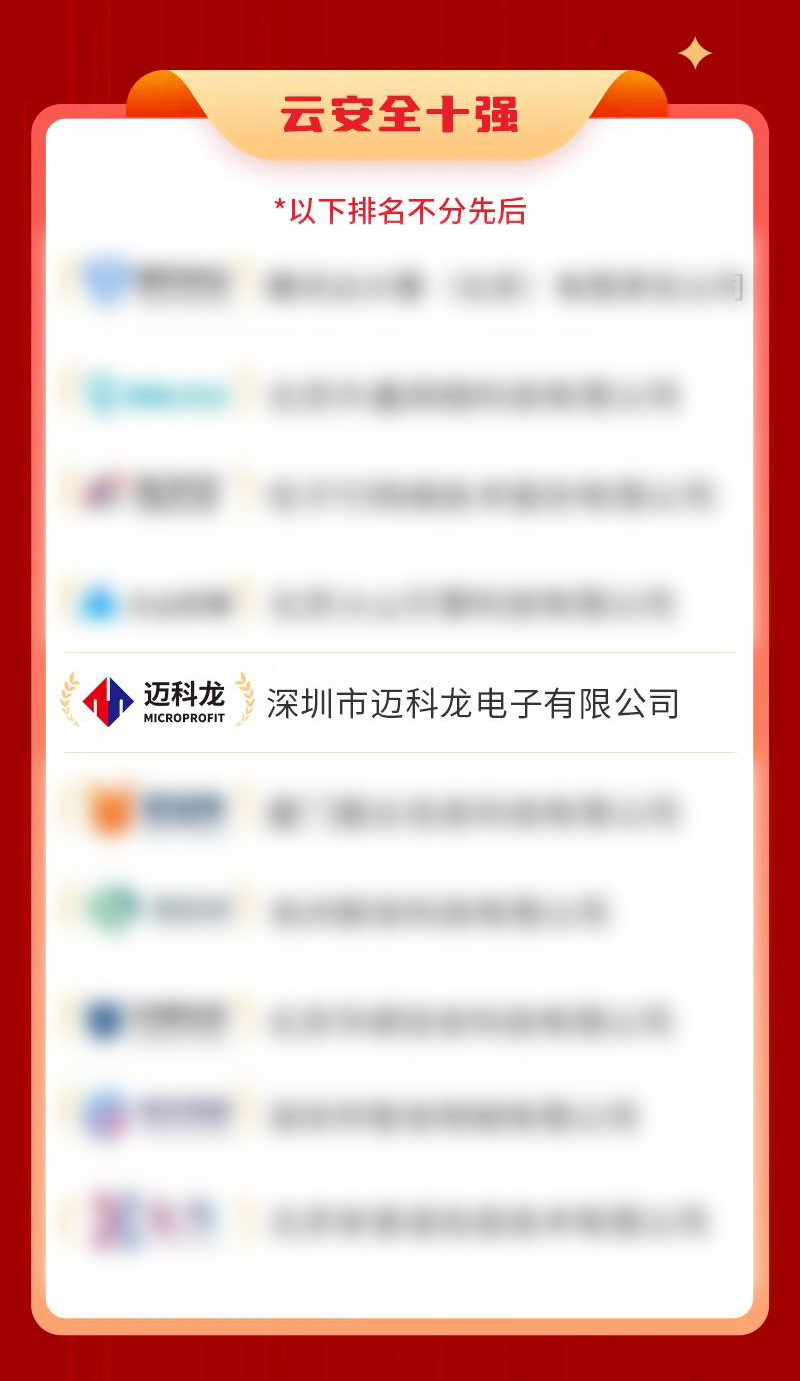 近日,迈科龙在2021年网络安全优秀企业及产品评选活动中脱颖而出,成功入选“云安全十强”。