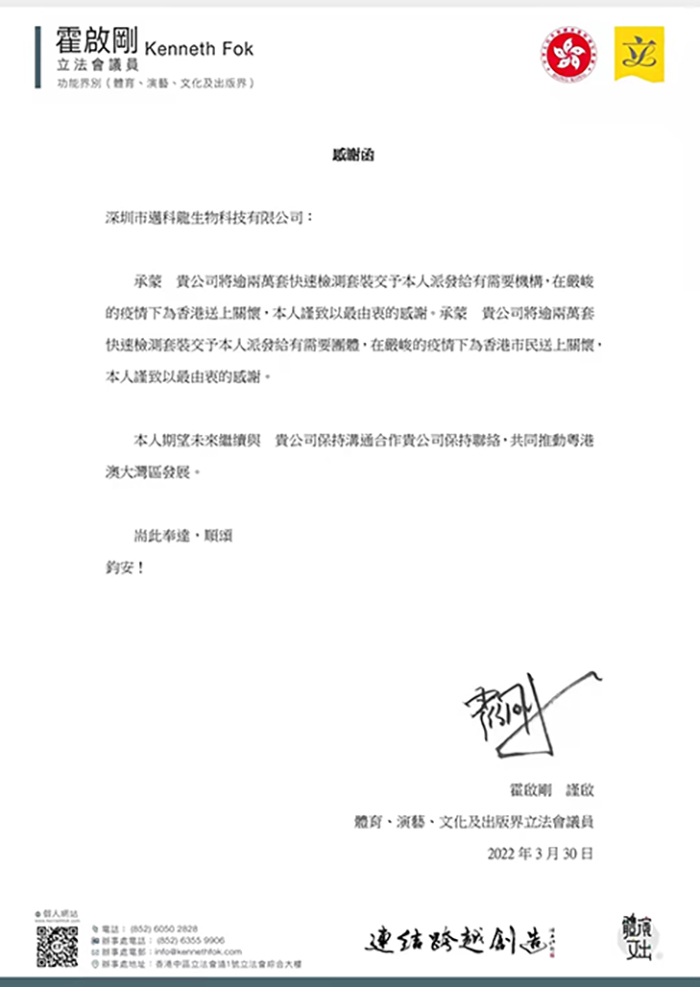 近日,迈科龙生物收到一封来自香港立法会议员的感谢信。信中写道:逾2万套快速检测套装已派发给有需要团体,对贵司在严峻疫情下捐赠抗疫物资包,为香港市民送上关怀致以最由衷的感谢。