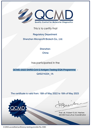 5月18日,由迈科龙生物自主研发的fluorecare®新冠病毒抗原检测试剂盒产品经过国际外部质量评估计划(EQA)试验对比,凭借优异的产品性能通过QCMD认证。