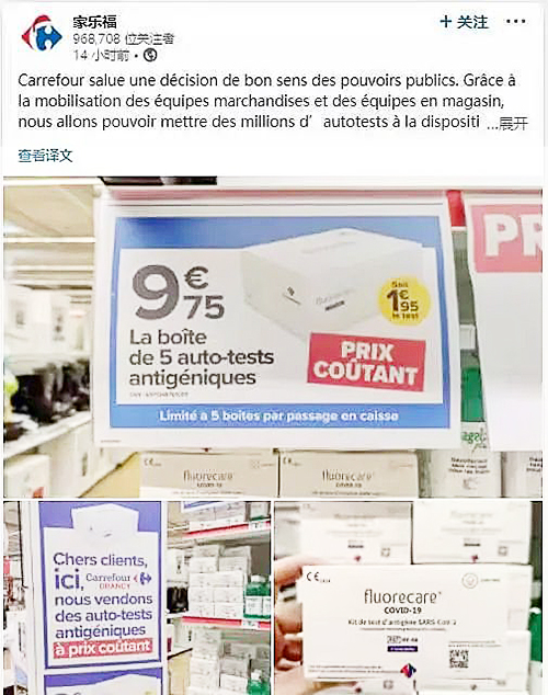 目前,flurecare® 新冠抗原检测试剂盒(胶体金法)(自测版)【SARS-CoV-2 Antigen Test Kit (Colloidal Gold Chromatographic Immunoassay)】已正式登陆法国家乐福超市,为法国全民健康保驾护航。