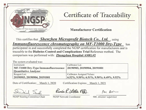 近日,迈科龙生物旗下POCT检测平台fluorecare®获得了美国国家糖化血红蛋白标准化计划(National Glycohemoglobin Standardization Program, NGSP)的认证。NGSP是评判糖化血红蛋白测定标准化的国际最高权威认证机构。此项认证表明,迈科龙生物fluorecare®平台的HbA1c测定的质量已符合国际标准,并得到同行认可。