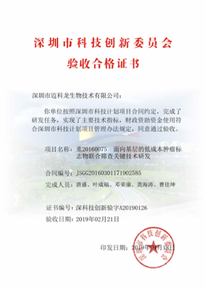 2019年4月18日,迈科龙生物公司收到深圳市科技创新委员会验收合格证书,公司承担的深圳市科技计划项目“面向基层的低成本肿瘤标志物联合筛查关键技术研发”验收通过。