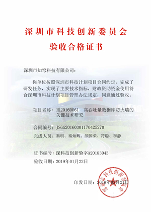 2019年3月21日,迈科龙集团知穹科技公司收到深圳市科技创新委员会验收合格证书,公司承担的深圳市科技计划项目“高吞吐量数据库防火墙的关键技术研究”验收通过。