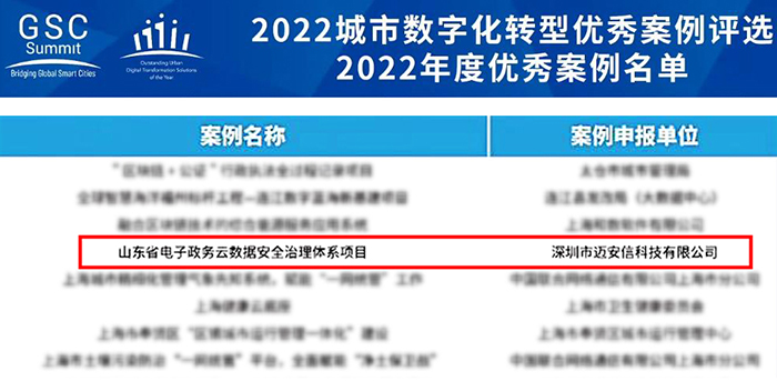 11月8日,“2022城市数字化转型优秀案例评选”年度盛典在上海隆重举行,迈科龙集团迈安信“山东省电子政务云数据安全治理体系项目”从全国41座城市申报的188个案例中脱颖而出、斩获大奖——“2022城市数字化转型优秀案例”,这也是该项目第二次获得行业权威认可,此前,该项目曾获评 “2021数据安全优秀样板工程”。