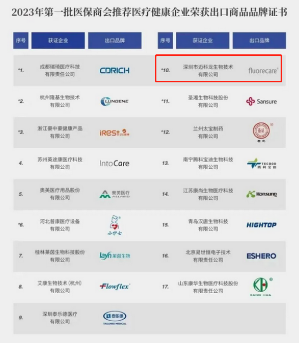 经中国医药保健品进出口商会初评推荐,迈科龙生物成为2023年首批通过出口商品品牌评价并荣获了由中国国际贸易促进委员会签发的“出口商品品牌证明书”的17家医疗健康企业之一。
