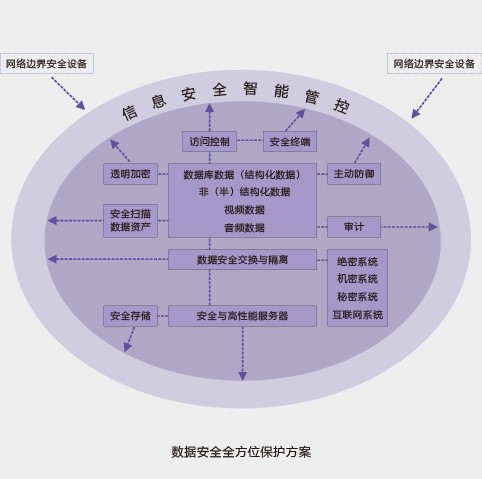 数据(包括结构化、非结构化数据、音频及视频等)透明加解密,访问控制,事件审计,数据库的主动防御与自动阻断。